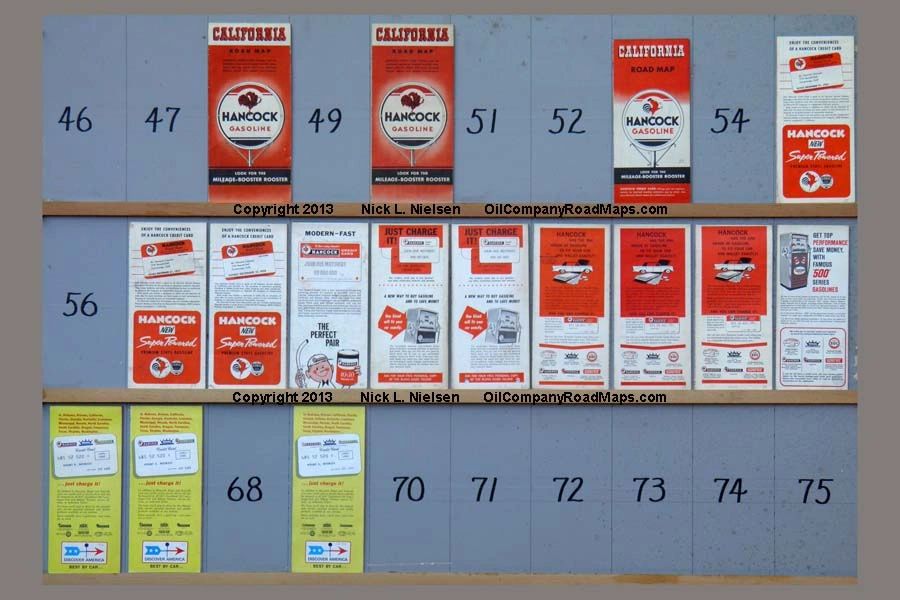 I collect Hancock Oil Company maps of California by year, as you can see I am still missing a few, I have inserted non-California maps in the slots for 1961 and 1964, but am looking for California versions for these years as well as others. If you have one of the ones I am missing I am an interested buyer.